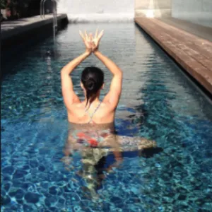 Rut Gómez es instructora de yoga que ayuda a profesoras de yoga a implementar un método de yoga con agua para que consigan incrementar ingresos trabajando en el sector premium